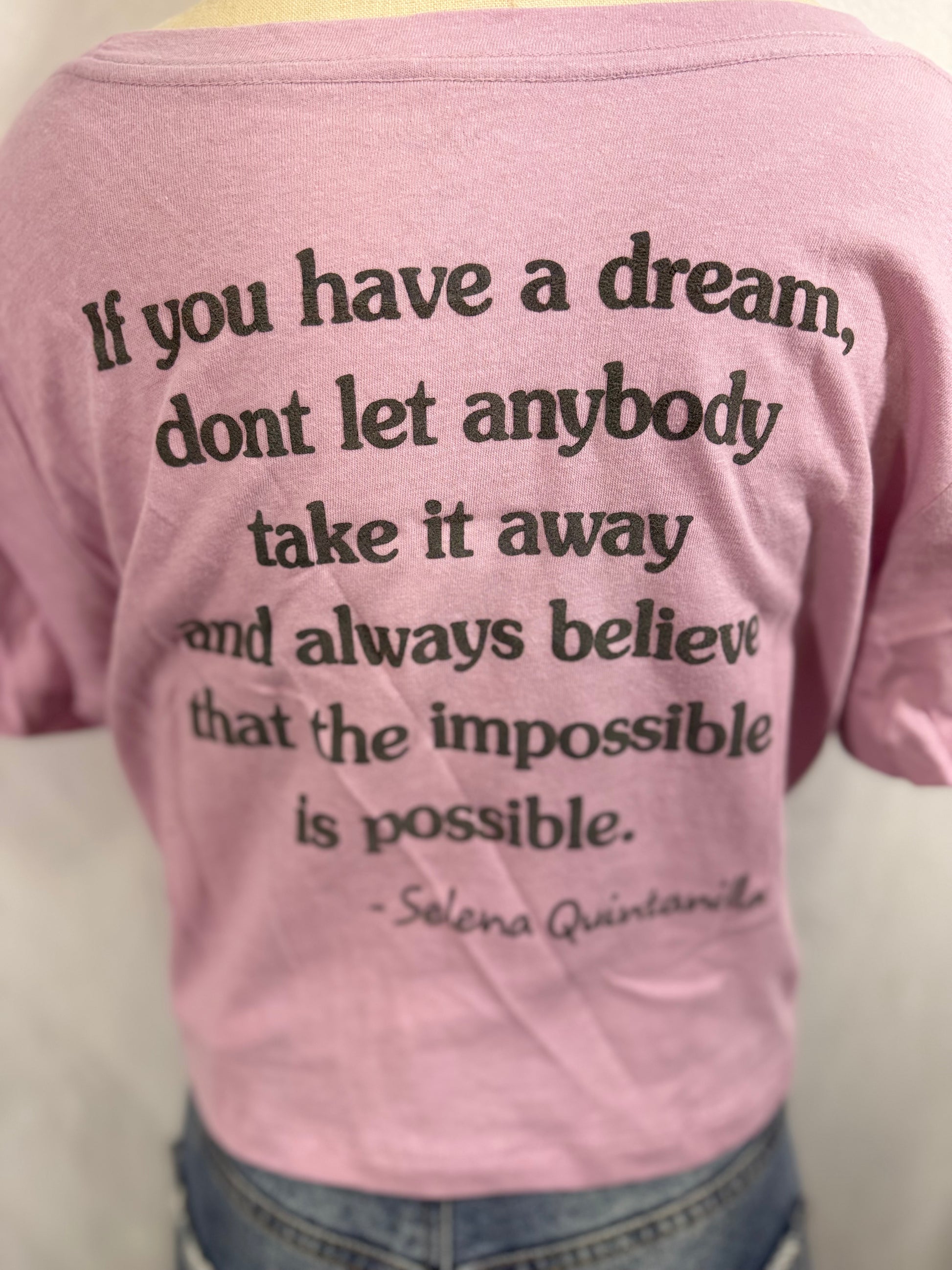 Celebrate the spirit of Texas royalty with this Queen of Tejano Music cropped graphic tee in regal purple. Featuring an inspiring Selena quote, "If you have a dream," this tee encourages you to pursue your passions boldly. Its comfortable fit and vibrant design make it perfect for showing pride in the legendary Selena and the power of chasing dreams every day.